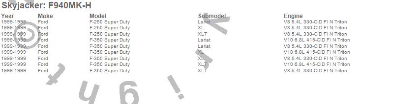 Brand: SkyjackerPart Number: F940MK-HLift Kit-Suspension w/Shock Type: Hydro Shocks - 4 in. Lift - Incl. Fr Leaf Springs - Track Bar Brkt - Fr/Rr UBolt Kits - Spring Bushing Kit - Rr Block - Sway End LinksUPC: