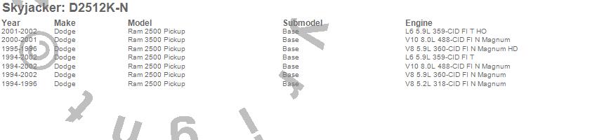 Brand: SkyjackerPart Number: D2512K-NLift Kit-Suspension w/Shock Type: Nitro Shocks - 2-2.5 in. Lift - Incl. Front Coil Spring - Rear Add-A-Leafs - Lower Links - Bump StopsUPC: