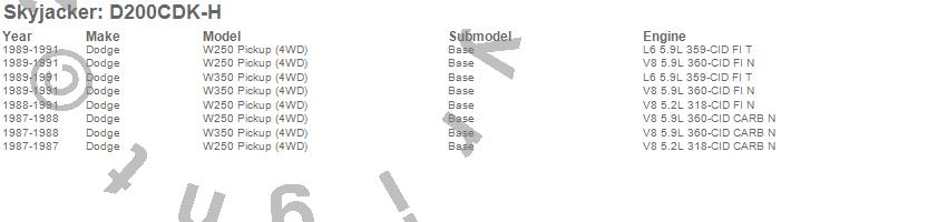 Brand: SkyjackerPart Number: D200CDK-HLift Kit-Suspension w/Shock Type: Hydro Shocks - 2.5 in. Front/2 in. Rear Lift - Incl. Front Leaf Springs - Front UBolt Kit - Front Bushing KitUPC: