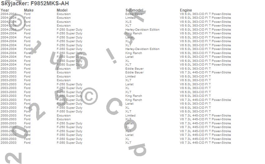 Brand: SkyjackerPart Number: F9852MKS-AHLift Kit-Suspension w/Shock Type: Hydro Shocks - 8 in. Lift - Incl Fr/Rr LfSpings - TrckBarBkt - UBltKit - SprngBushings - SwyBarLnk - PtmnArm - BrkLn - CarrBrngUPC:
