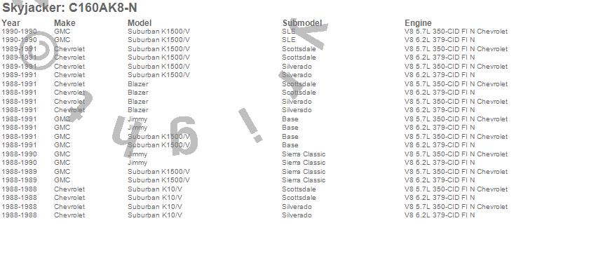Brand: SkyjackerPart Number: C160AK8-NLift Kit-Suspension w/Shock Type: Nitro Shocks - 6 in. Lift - Incl. Front Leaf Springs - Front/Rear UBolt Kits - Bushing Kit - Rear Block - Brake Line BracketsUPC: