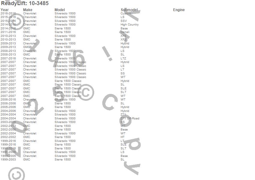 Below is an abbreviated list of applications for the Wheel Spacer.Sierra 1500, Sierra 1500 Classic, Silverado 1500, Silverado 1500 Classic, Chevrolet, GMC, 2016, 2015, 2014, 2013, 2012, 2011, 2010, 2009, 2008, 2007, 2006, 2005, 2004, 2003